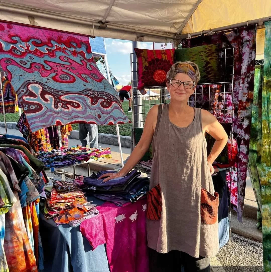 Jill Miller: Hooey Batiks - Hooeybatiks@gmail.com - WEBSITE - INSTAGRAM - Hooey Batiks, created by Jill Miller, is a collection of hand-dyed clothing and home goods inspired by vibrant colors and organic patterns. Using techniques like batik, ice dye, and shibori, Jill brings a modern twist to traditional fiber art methods