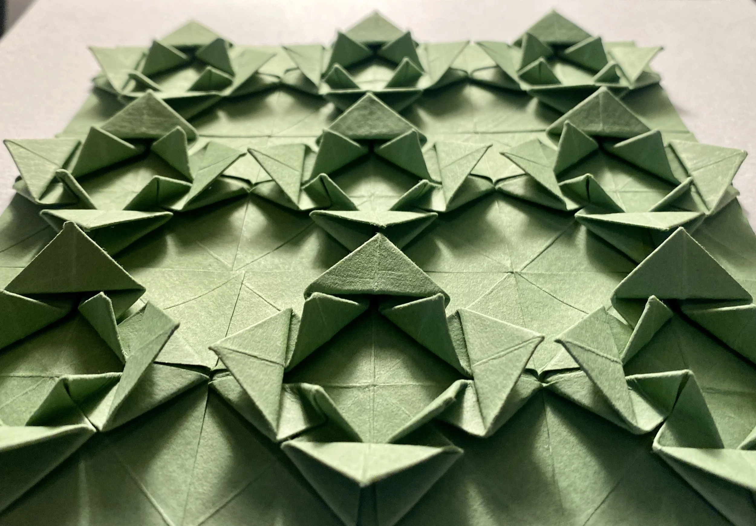 John Odum: folded paper, sculpture, oil paint - WEBSITE - JohnOdumArt@gmail.com - (217)840-4482 - In his art, John explores themes of structure, order, and (un)predictability using patterns and shapes. His work is often driven by the manipulation of the geometric planes found in paper and wood.